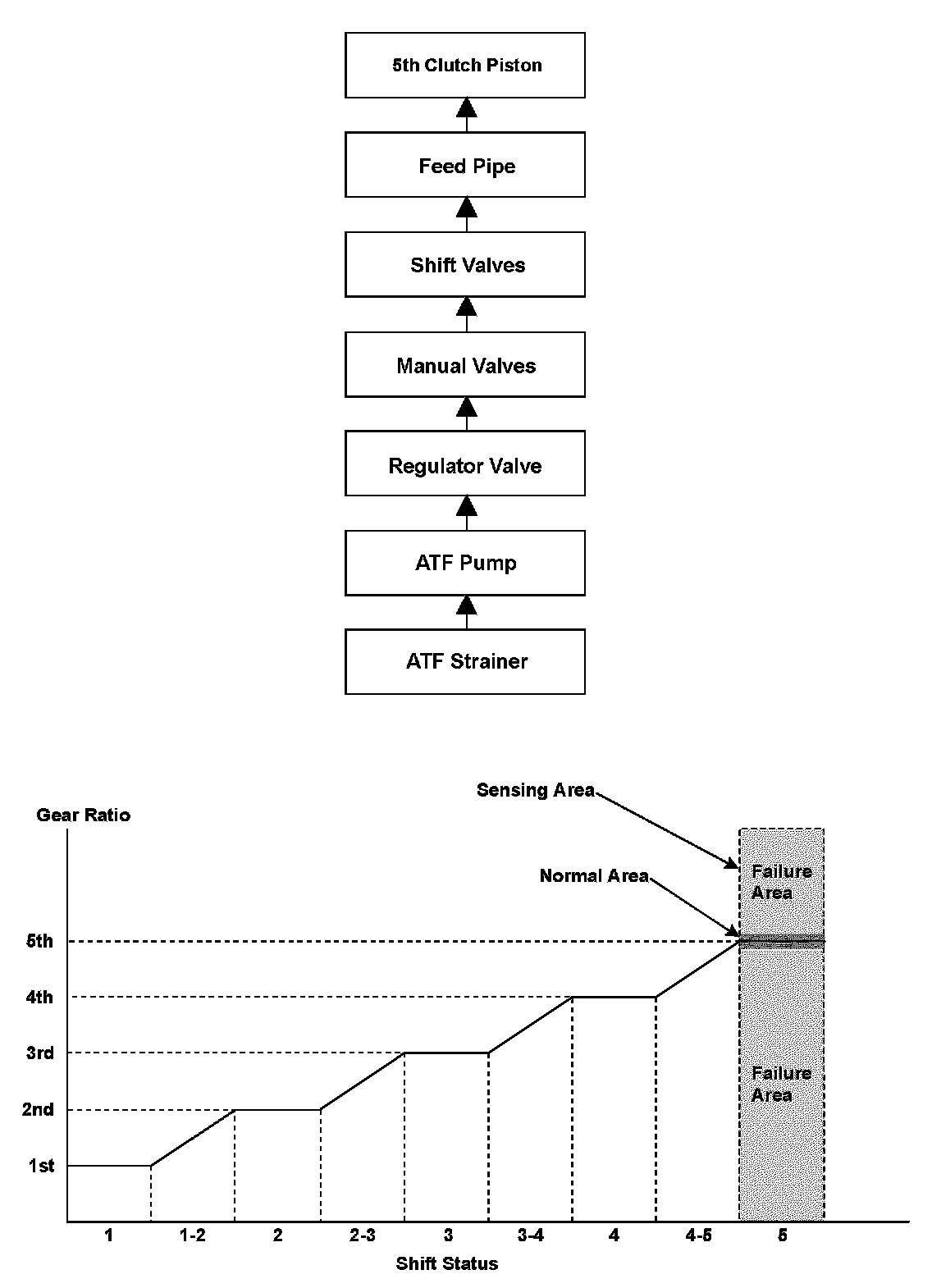 To engage 5th gear, line pressure is supplied to the 5th clutch piston, engaging the 5th clutch, and the input shaft (mainshaft) and the input shaft (mainshaft) 5th gear are connected and revolve together. Hydraulic pressure is supplied to the 5th clutch through the ATF strainer the ATF pump the regulator valve the manual valve the shift valves the feed pipe 5th clutch piston. (A shift valve failure in the supply route above is detected by the malfunction detection of each shift solenoid valve.) The powertrain control module (PCM) computes the ratio of the input shaft (mainshaft) speed to the output shaft (countershaft) speed. When the ratio is not the 5th gear ratio, it is detected as a malfunction of the hydraulic circuit or the 5th clutch, and a DTC is stored.