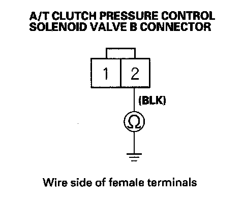 9. Measure resistance between A/T clutch pressure control solenoid valve B connector terminals No. 1 and No. 2.