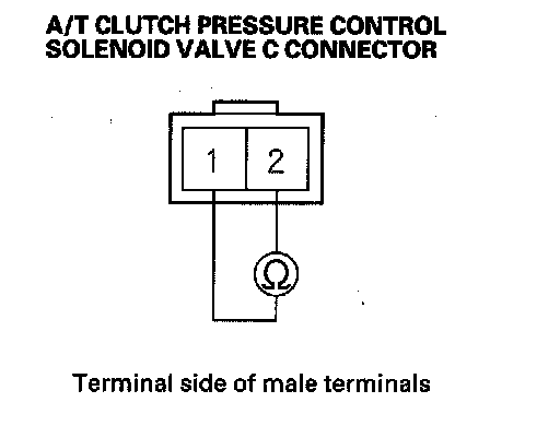 9. Measure resistance between A/T clutch pressure control solenoid valve C connector terminals No. 1 and No. 2.
