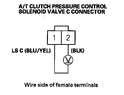 12. Measure voltage between A/T clutch pressure control solenoid valve C connector terminals No. 1 and No. 2.