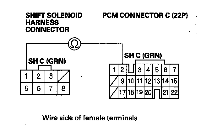 13. Check for continuity between PCM connector terminal C2 and shift solenoid harness connector terminal No. 1.