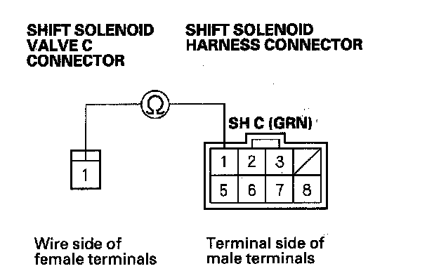 15. Check for continuity between shift solenoid harness connector terminal No. 1 and the shift solenoid valve C connector terminal.