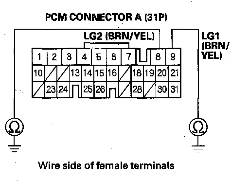 5. Check for continuity between PCM connector terminal A8 and body ground, and between PCM connector terminal A9 and body ground.