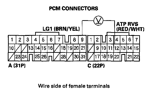 8. Measure voltage between PCM connector terminals C12 and A9.