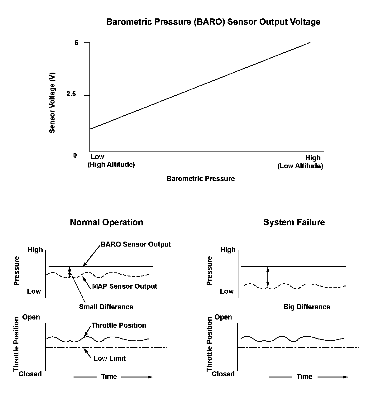 If the throttle position is beyond a value stored in the ECM/PCM that is used to detect wide-open throttle and if the difference between the MAP sensor output and the BARO sensor output is equal to or greater than a set value, a malfunction in the BARO sensor output is detected and a DTC is stored.