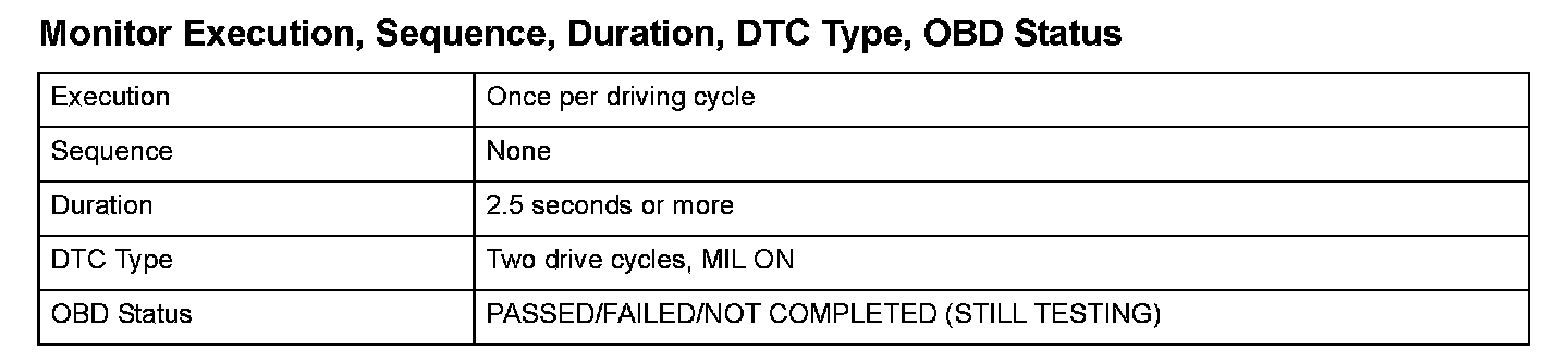 Monitor Execution, Sequence, Duration, DTC Type, OBD Status