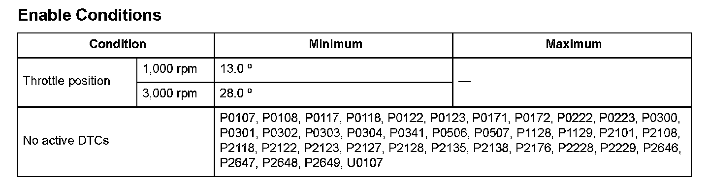 2. Drive the vehicle with the throttle position as specified under Enable Conditions for at least 2.5 seconds.