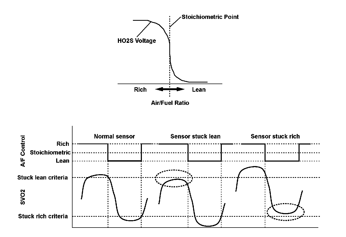 The secondary HO2S detects the oxygen concentration in the exhaust gas downstream of the three-way catalyst (TWC). The sensor output voltage characteristics are similar to the air/fuel ratio (A/F) sensor. The oxygen concentration is detected after the TWC during fuel feedback control using the A/F sensor, and it optimizes the fuel feedback control to maximize the effect of the TWC. If, after current is applied to the secondary HO2S heater, the secondary HO2S does not fluctuate and the output is stuck within the specified area, a malfunction is detected and a DTC is stored.