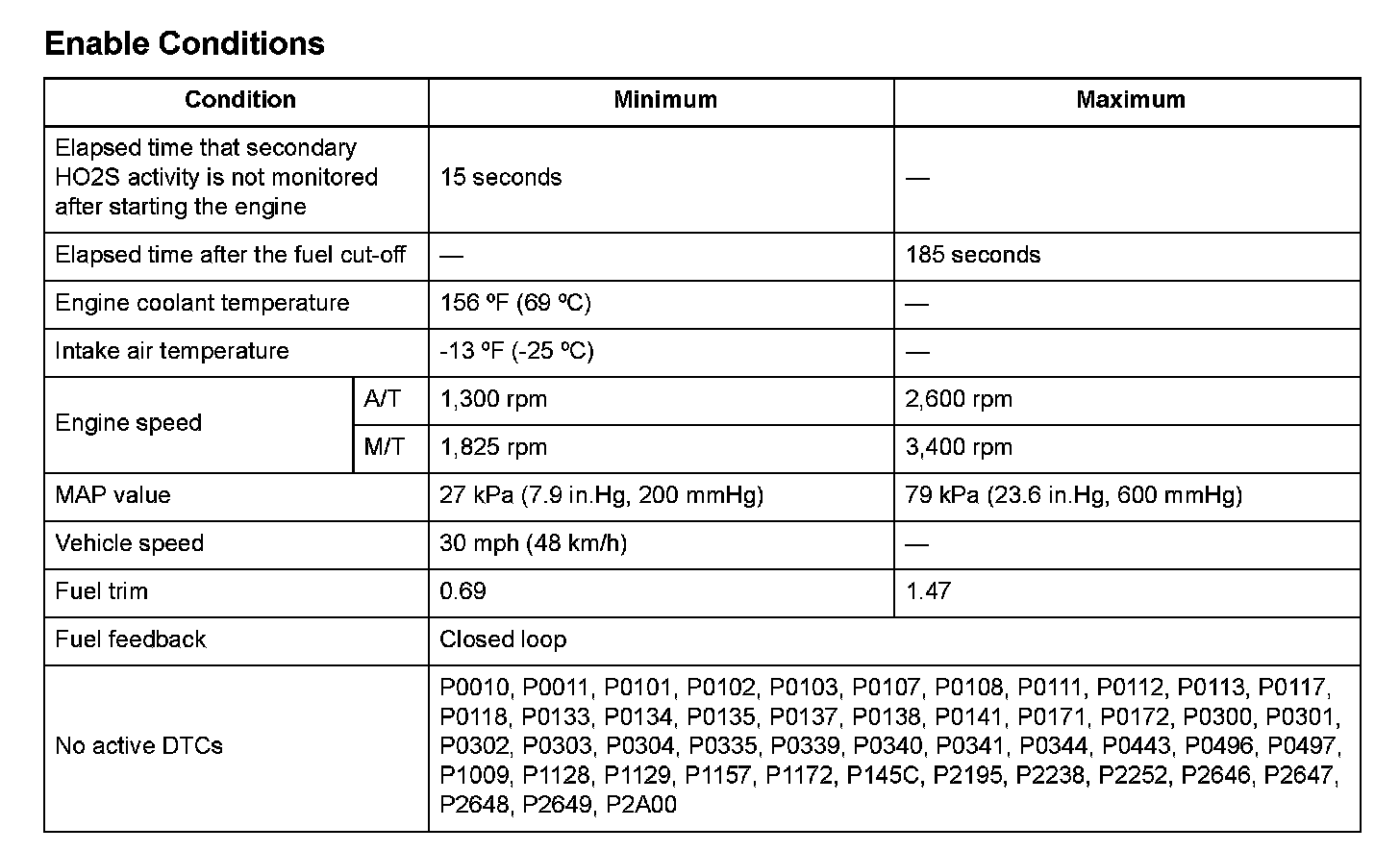 The secondary HO2S output voltage is 0.650 V or less.