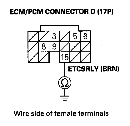 9. Check for continuity between ECM/PCM connector terminal D15 and body ground.