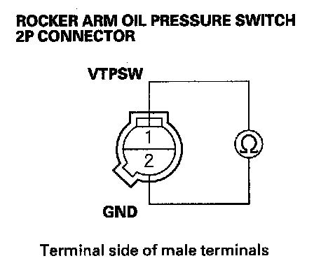 8. At the switch side, check for continuity between rocker arm oil pressure switch 2P connector terminals No. 1 and No. 2.