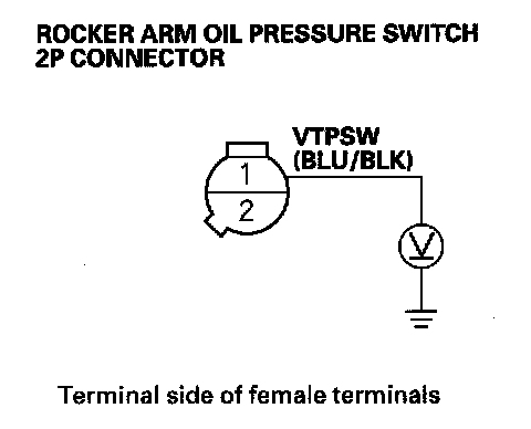 10. Measure voltage between rocker arm oil pressure switch 2P connector terminal No. 1 and body ground.