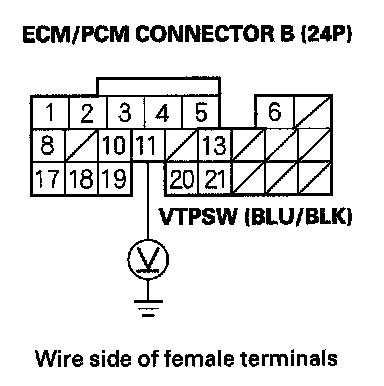11. Measure voltage between ECM/PCM connector terminal B11 and body ground.
