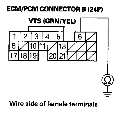 12. Check for continuity between ECM/PCM connector terminal B6 and body ground.