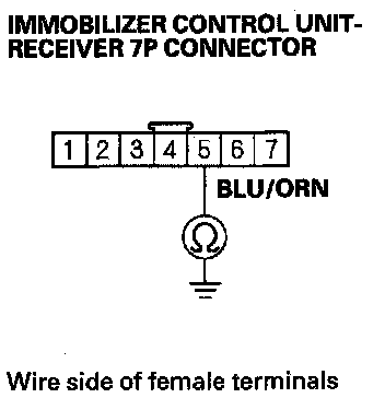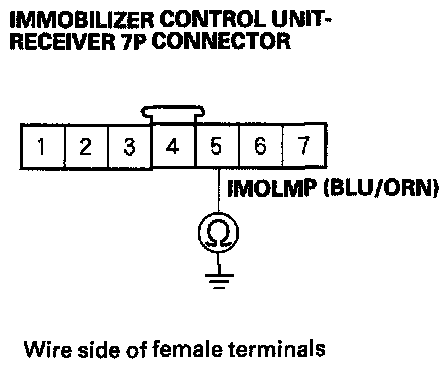 11. Check for continuity between the immobilizer control unit-receiver 7P connector No. 5 (IMOLMP) terminal and body ground.