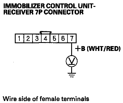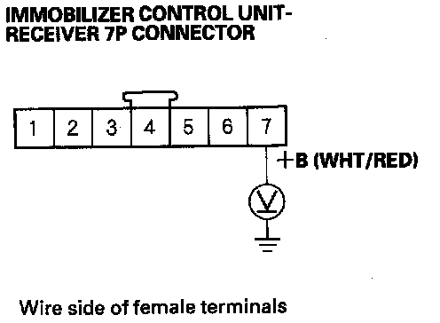 15. Check for voltage between the immobilizer control unit-receiver 7P connector No. 7 (+B) terminal and body ground.