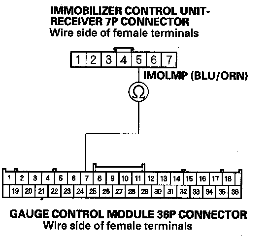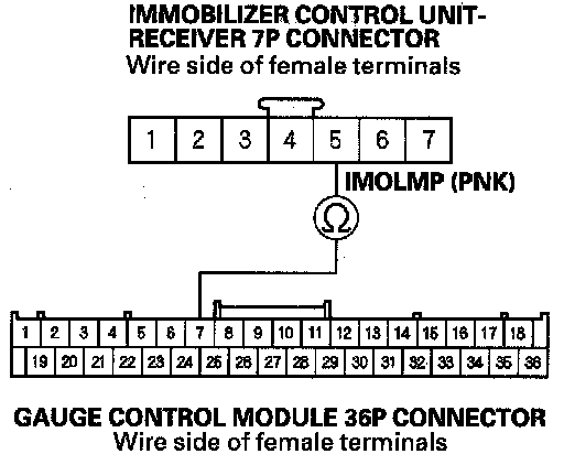 17. Check for continuity between the immobilizer control unit-receiver 7P connector No. 5 (IMOLMP) terminal and gauge control module 36P connector No. 7 terminal.