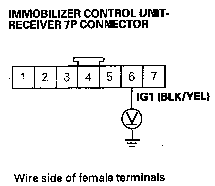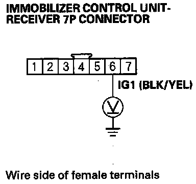 21. Check for voltage between the immobilizer control unit-receiver 7P connector No. 6 (IG1) terminal and body ground.