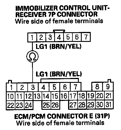 27. Check for continuity between the immobilizer control unit-receiver 7P connector No. 1 (LG1) terminal and ECM/PCM connector E (31P) No. 3 terminal.