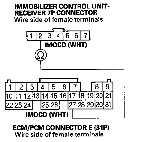 45. Check for continuity between the immobilizer control unit-receiver 7P connector No. 2 (IMOCD) terminal and ECM/PCM connector E (31P) No. 27 (IMOCD) terminal.