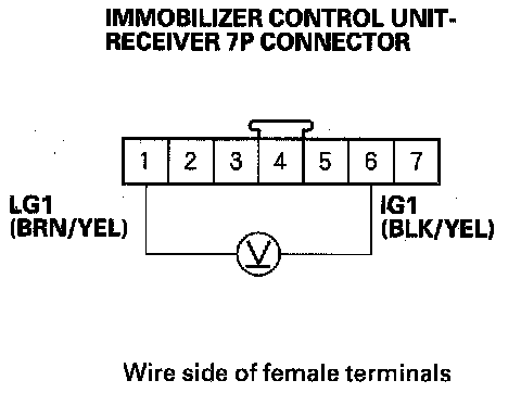 23. Check for voltage between the immobilizer control unit-receiver 7P connector No. 1 (LG1) and No. 6 (IG1) terminals.