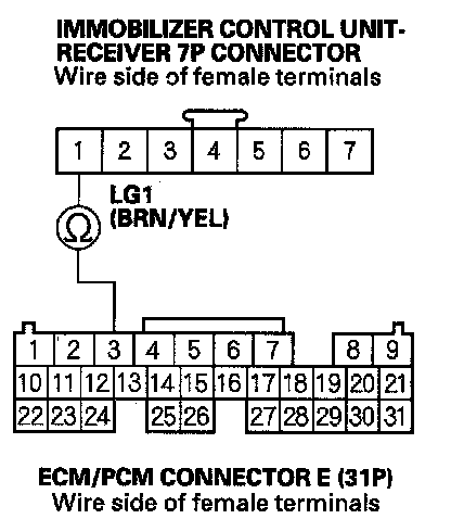 23. Check for continuity between the immobilizer control unit-receiver 7P connector No. 1 (LG1) terminal and ECM/PCM connector E (31P) No. 3 terminal.