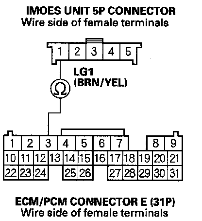 28. Check for continuity between the IMOES unit 5P connector No. 1 (LG1) terminal and ECM/PCM connector E (31P) No. 3 terminal.