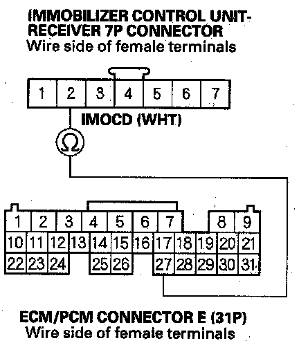 37. Check for continuity between the immobilizer control unit-receiver 7P connector No. 2 (IMOCD) terminal and ECM/PCM connector E (31P) No. 27 terminal.