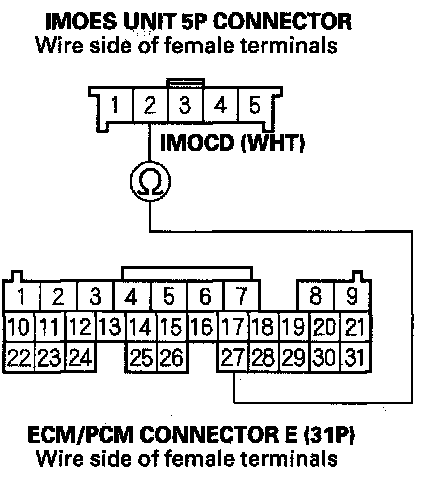 46. Check for continuity between the IMOES unit 5P connector No. 2 (IMOCD) terminal and ECM/PCM connector E (31P) No. 27 (IMOCD) terminal.