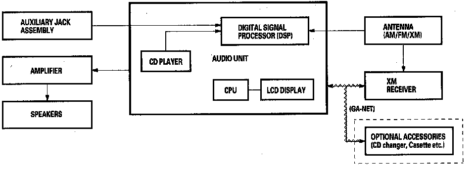 The XM receiver passes its signal to the audio unit. In addition, it communicates with the audio unit via the GA-Net bus. Any open connections in the GA-Net bus circuit will cause audio functions to appear inoperative.