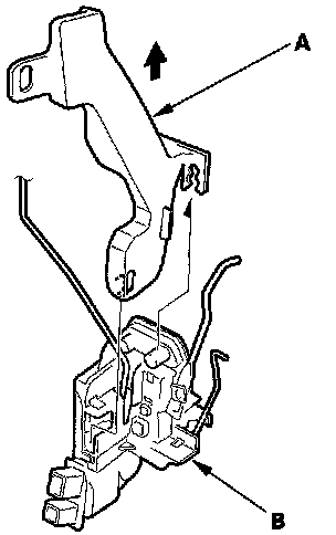7. Pull the latch (A) out until you can disconnect the inner handle rod (B), then disconnect the rod.