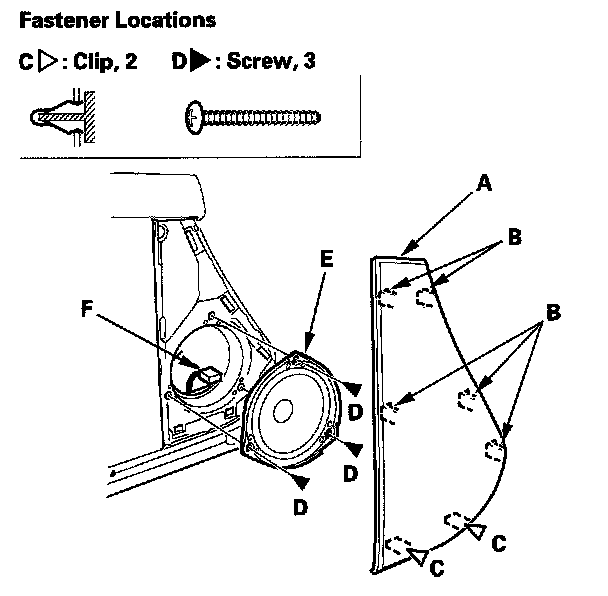 1. Release the clips that hold the door panel with a commercially available trim pad remover (B).