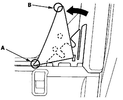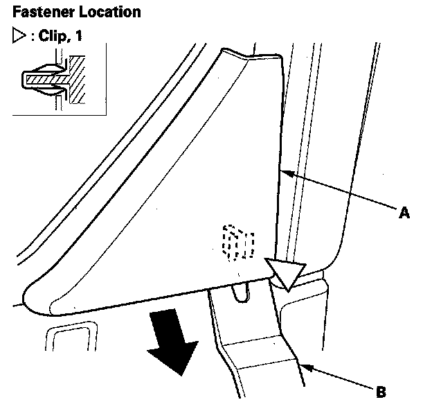 8. Use a trim tool (B) to release the clip at the lower rear corner of the sash trim. Pry out from the edge of the sash trim until the clip releases.