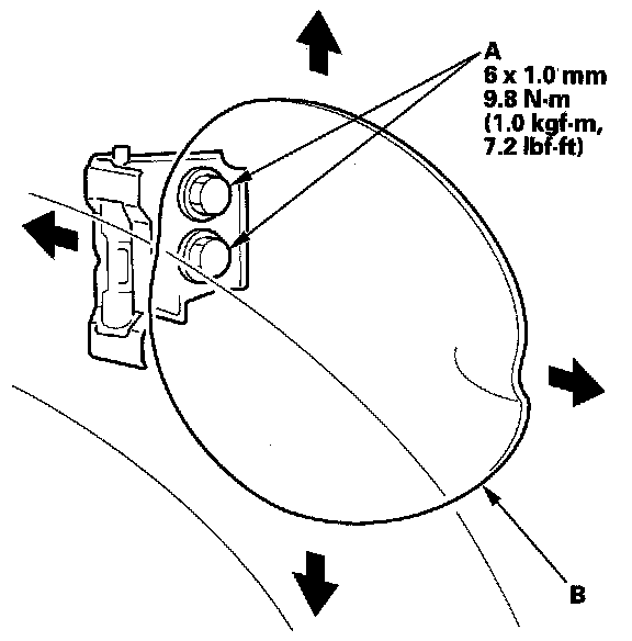 2. Adjust the fuel fill door (B) in or out until it's flush with the body, and up or down as necessary to equalize the gaps.