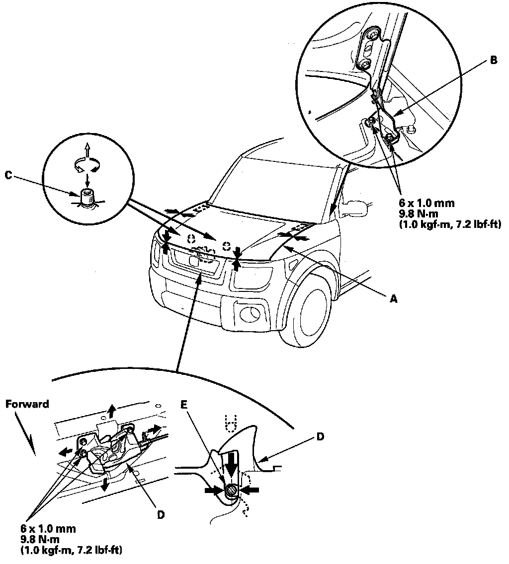 4. Adjust the hood latch (D) to obtain the proper height at the forward edge, and move the hood latch right or left until the striker (E) is centered in the hood latch.