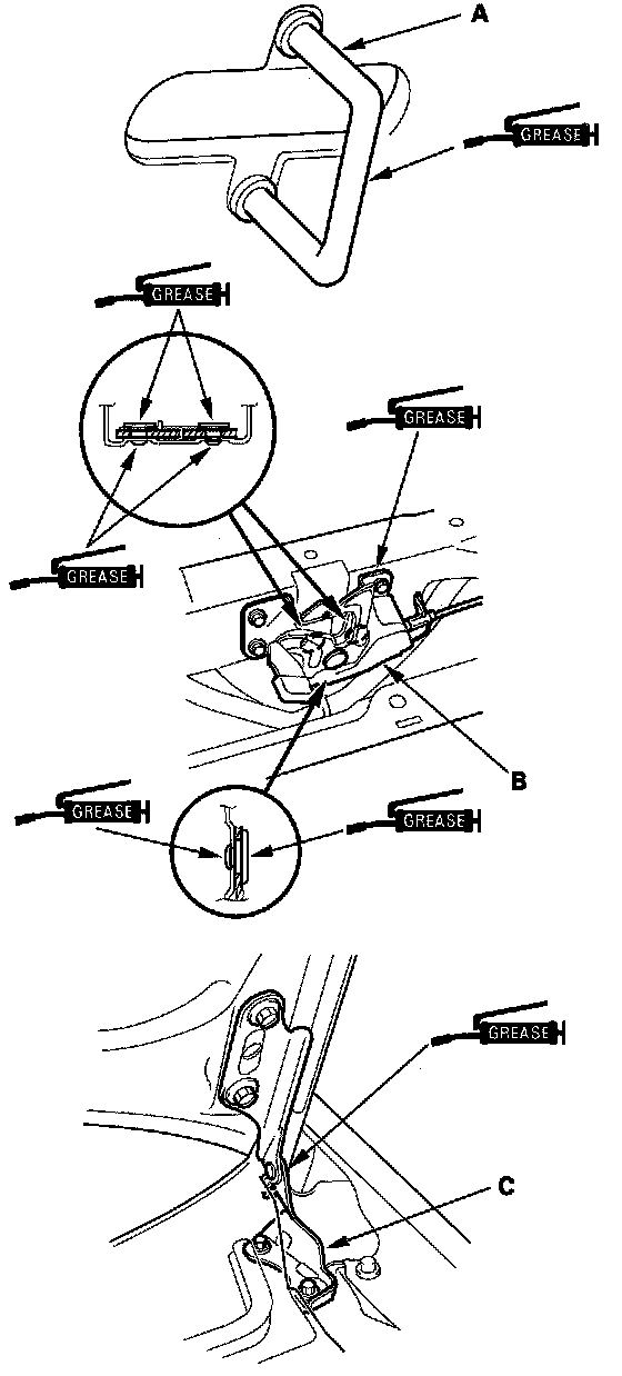 8. Apply multipurpose grease to the hood striker (A), hood latch (B), and hood hinge (C) as indicated by the arrows.