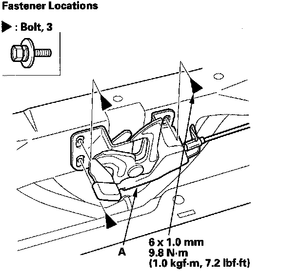 2. Remove the bolts, then remove the hood latch (A) from the body.