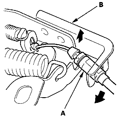 3. Disconnect the hood opener cable (A) from the hood latch (B). Take care not to bend the cable.