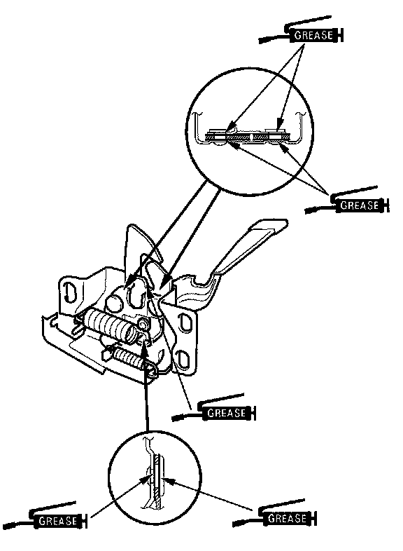 - Apply multipurpose grease to the location of the hood latch indicated by the arrows.