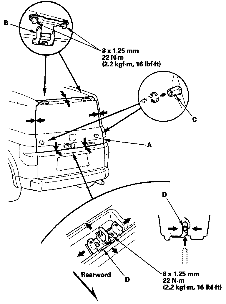 - Pull down the rear portion of the headliner. Take care not to bend the headliner excessively. Adjust the hatch hinges (B) right and left, as well as forward and rearward, using the elongated holes.