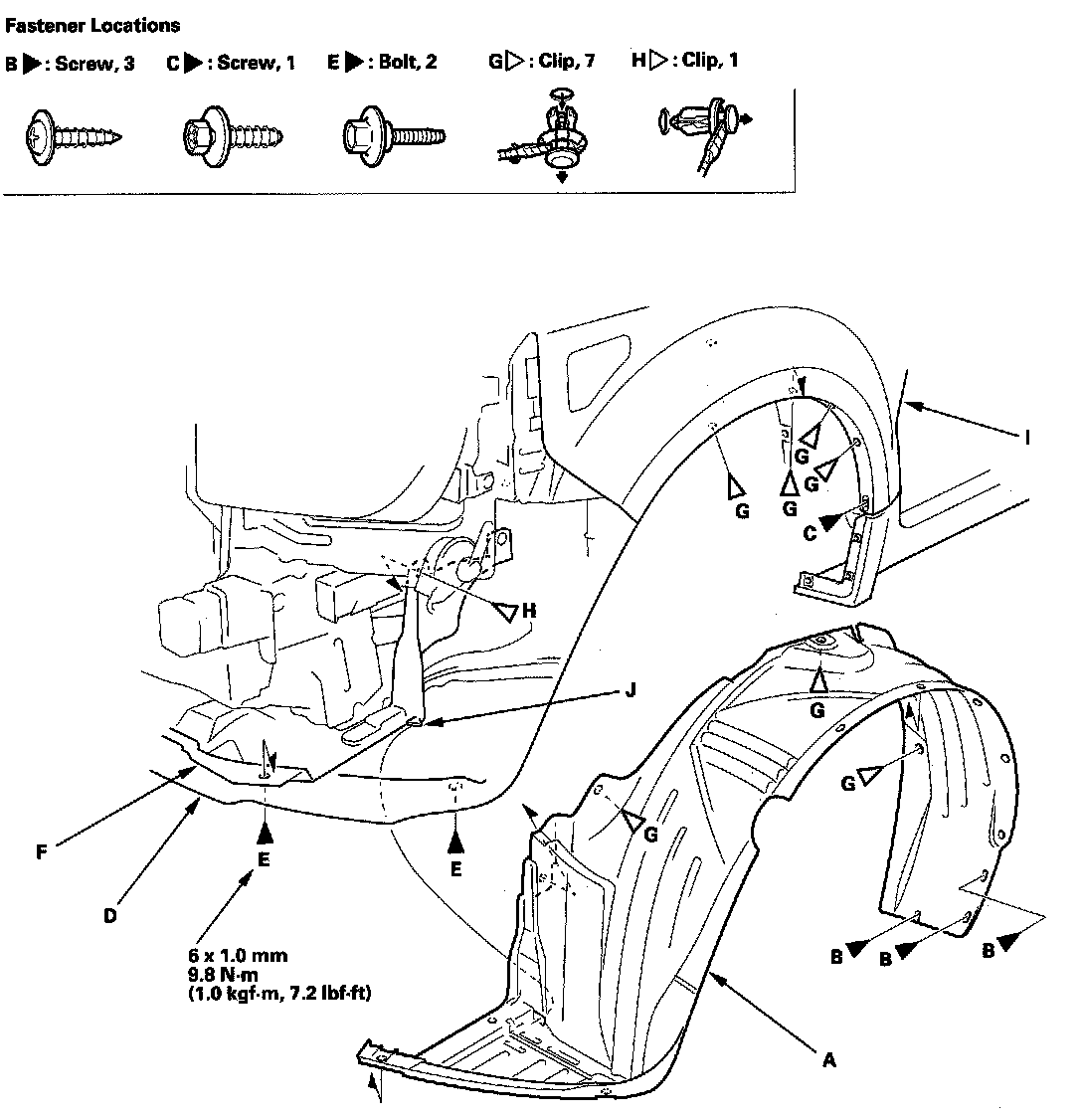 4. Release the hook (J) of the splash shield from the front inner fender.