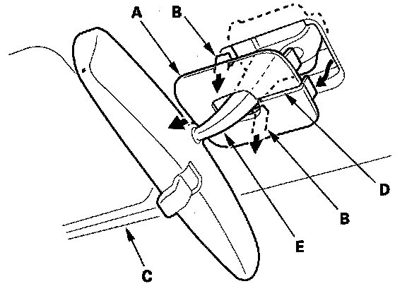 1. Using the appropriate tool from the KTC trim tool set, carefully remove the headliner cap (A) by releasing the hooks (B) from the headliner (C), and remove the cap through the slit (D) on it from the rearview mirror stay (E). Take care not to scratch the cap and headliner.