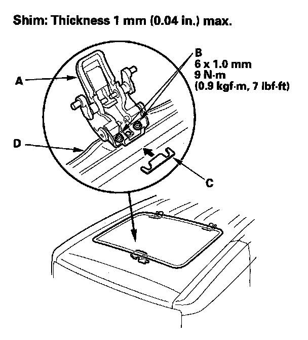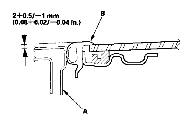 Glass Height AdjustmentThe roof panel (A) should be even with the glass weatherstrip (B), to within 2+0.5/-1 mm (0.08+0.02/-0.04 in.) at the center of the glass opening. If not, make the following adjustment: