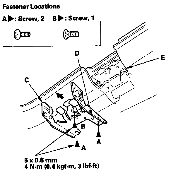 3. Remove the screws (A, B), then remove the latch bracket (C).