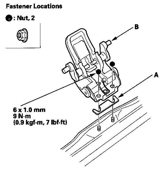 3. Remove the nuts and shim (A), then remove the glass latch (B).