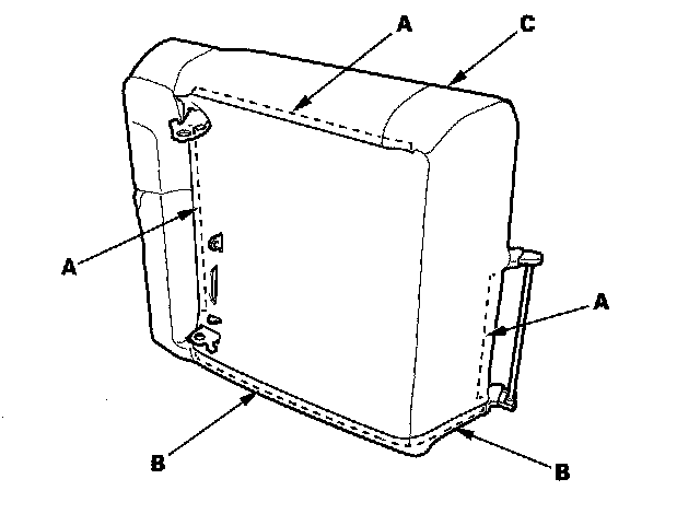 9. Pull back the seat cushion cover. Remove the screw (A), and pull the recline cover (B) down to release the hook (C).