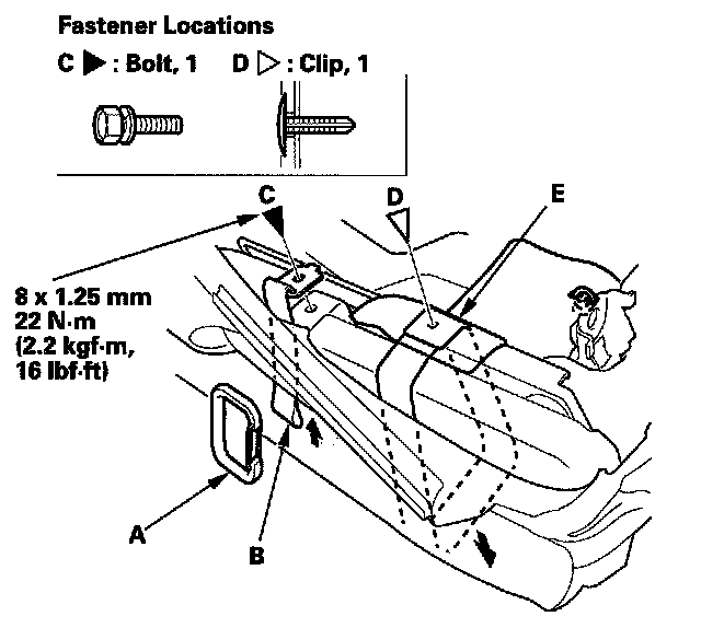6. Remove the clip (D), and pull the strap (E) out.