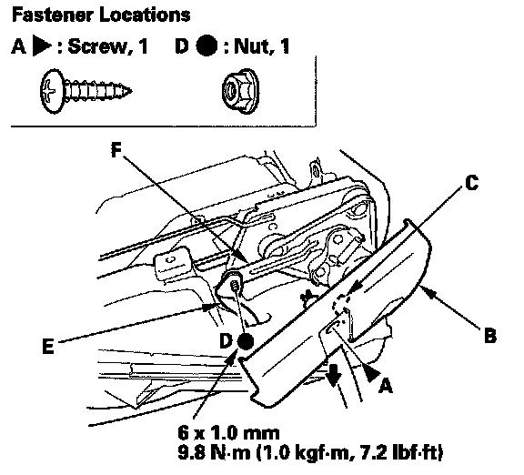 10. Remove the nut (D), then remove the recline strap (E) from the recline adjuster lever (F).