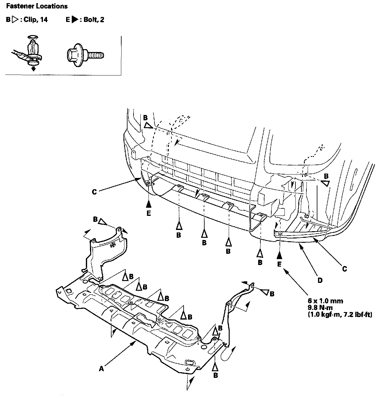 2. From under the front bumper (D), remove the clips (B) and bolts (E).