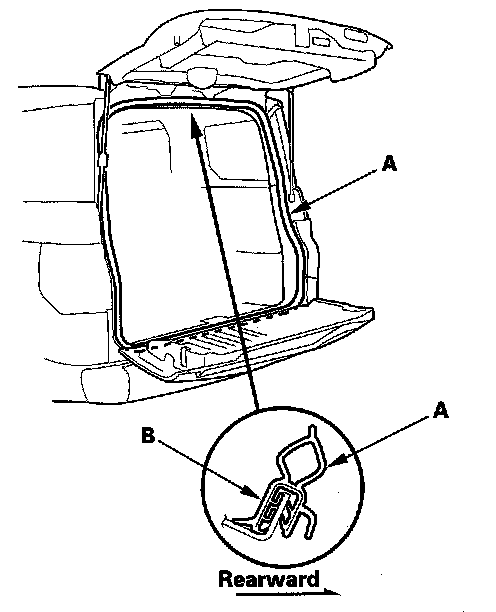 4. Locate the painted alignment mark (B) on the hatch weatherstrip. Align the painted mark with the alignment tab in the center of the hatch opening, and install the hatch weatherstrip all the way around in the direction shown. Make sure there are no wrinkles in the weatherstrip.